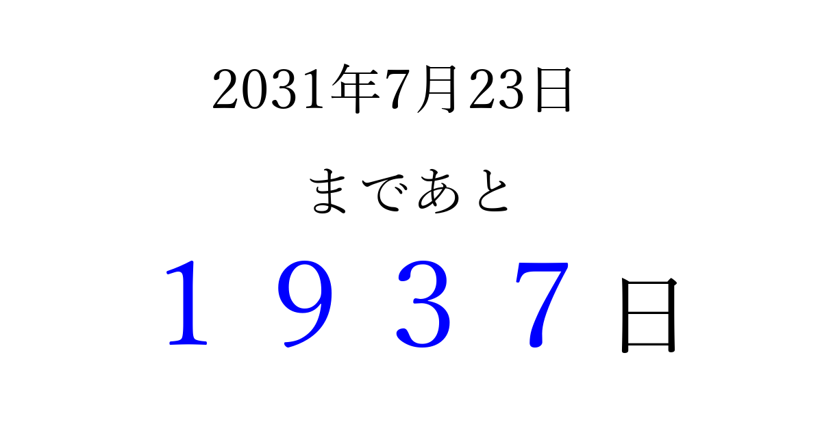 2031年7月23日(水)まで あと 9999 日です 追加すると、トップページからすぐ選べるようになります ※2026/04/03現在の結果です。 最新の状態に更新する ↓シェアして、タイムライン上にカウントダウンを表示しよう!↓ 📤 この結果を共有する Tweet シェア Threads Bluesky 別の日付でカウントダウン 2031年7月のカレンダー このページをブックマークに追加すると、いつでもカウントダウンを確認できます。 (PC: Ctrl+D / Mac: ⌘+D) hitome-notes.comでは以下のページも運営しています。 指定日と期間から日付を計算 | ガチャ確率計算・シミュレーション | プライバシー・ポリシー 運営者:Avocado