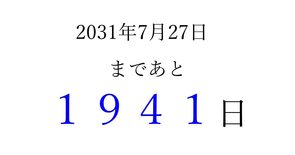 2031年7月27日(日)まで あと 9999 日です 追加すると、トップページからすぐ選べるようになります ※2026/04/03現在の結果です。 最新の状態に更新する ↓シェアして、タイムライン上にカウントダウンを表示しよう!↓ 📤 この結果を共有する Tweet シェア Threads Bluesky 別の日付でカウントダウン 2031年7月のカレンダー このページをブックマークに追加すると、いつでもカウントダウンを確認できます。 (PC: Ctrl+D / Mac: ⌘+D) hitome-notes.comでは以下のページも運営しています。 指定日と期間から日付を計算 | ガチャ確率計算・シミュレーション | プライバシー・ポリシー 運営者:Avocado