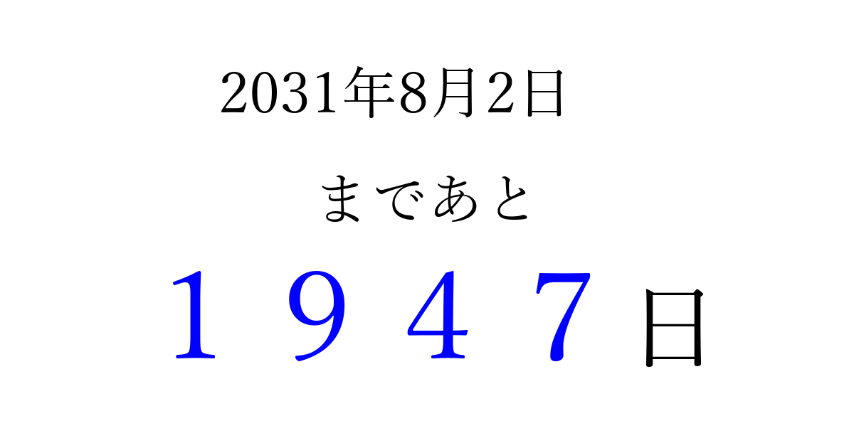 2031年8月2日(土)まで あと 9999 日です 追加すると、トップページからすぐ選べるようになります ※2026/04/03現在の結果です。 最新の状態に更新する ↓シェアして、タイムライン上にカウントダウンを表示しよう!↓ 📤 この結果を共有する Tweet シェア Threads Bluesky 別の日付でカウントダウン 2031年8月のカレンダー このページをブックマークに追加すると、いつでもカウントダウンを確認できます。 (PC: Ctrl+D / Mac: ⌘+D) hitome-notes.comでは以下のページも運営しています。 指定日と期間から日付を計算 | ガチャ確率計算・シミュレーション | プライバシー・ポリシー 運営者:Avocado
