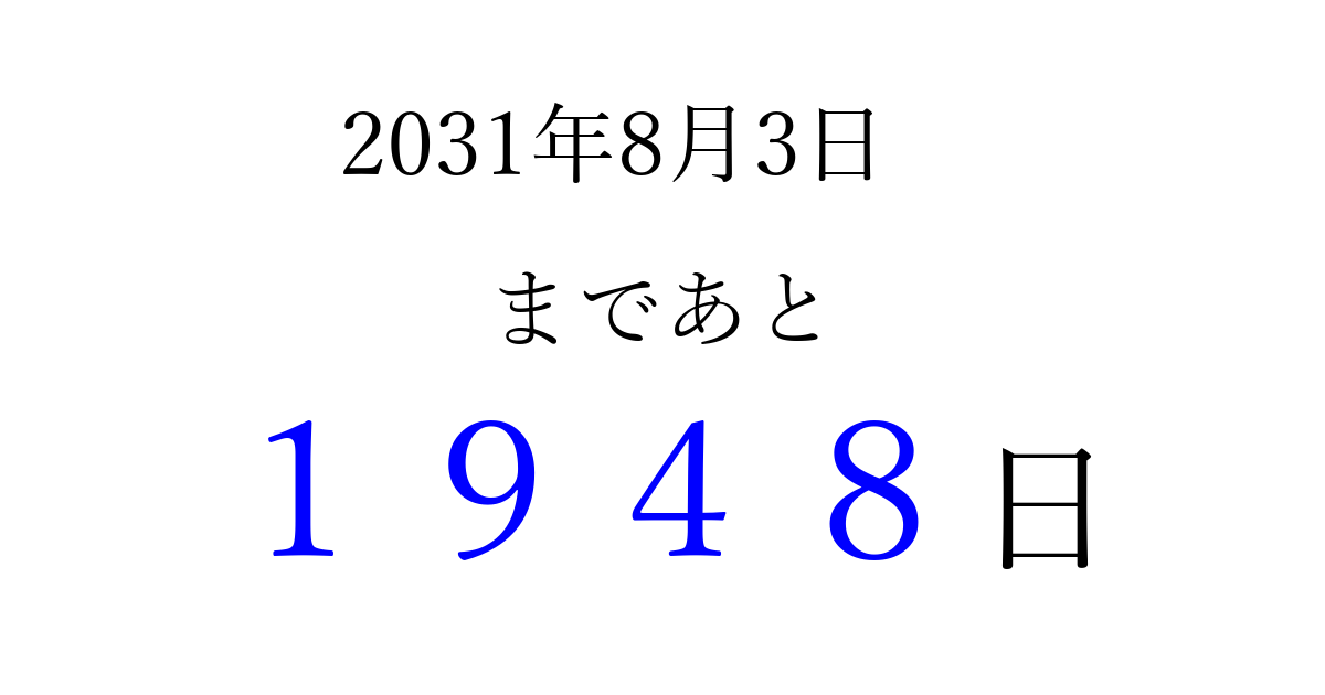 2031年8月3日(日)まで あと 9999 日です 追加すると、トップページからすぐ選べるようになります ※2026/04/03現在の結果です。 最新の状態に更新する ↓シェアして、タイムライン上にカウントダウンを表示しよう!↓ 📤 この結果を共有する Tweet シェア Threads Bluesky 別の日付でカウントダウン 2031年8月のカレンダー このページをブックマークに追加すると、いつでもカウントダウンを確認できます。 (PC: Ctrl+D / Mac: ⌘+D) hitome-notes.comでは以下のページも運営しています。 指定日と期間から日付を計算 | ガチャ確率計算・シミュレーション | プライバシー・ポリシー 運営者:Avocado