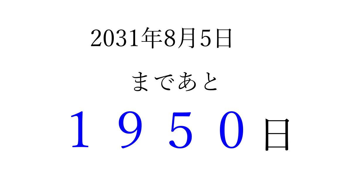 2031年8月5日(火)まで あと 9999 日です 追加すると、トップページからすぐ選べるようになります ※2026/04/03現在の結果です。 最新の状態に更新する ↓シェアして、タイムライン上にカウントダウンを表示しよう!↓ 📤 この結果を共有する Tweet シェア Threads Bluesky 別の日付でカウントダウン 2031年8月のカレンダー このページをブックマークに追加すると、いつでもカウントダウンを確認できます。 (PC: Ctrl+D / Mac: ⌘+D) hitome-notes.comでは以下のページも運営しています。 指定日と期間から日付を計算 | ガチャ確率計算・シミュレーション | プライバシー・ポリシー 運営者:Avocado