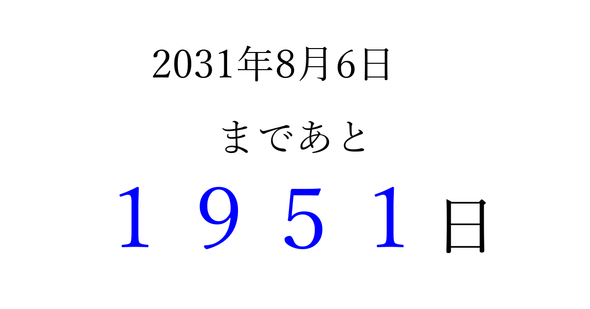 2031年8月6日(水)まで あと 9999 日です 追加すると、トップページからすぐ選べるようになります ※2026/04/03現在の結果です。 最新の状態に更新する ↓シェアして、タイムライン上にカウントダウンを表示しよう!↓ 📤 この結果を共有する Tweet シェア Threads Bluesky 別の日付でカウントダウン 2031年8月のカレンダー このページをブックマークに追加すると、いつでもカウントダウンを確認できます。 (PC: Ctrl+D / Mac: ⌘+D) hitome-notes.comでは以下のページも運営しています。 指定日と期間から日付を計算 | ガチャ確率計算・シミュレーション | プライバシー・ポリシー 運営者:Avocado