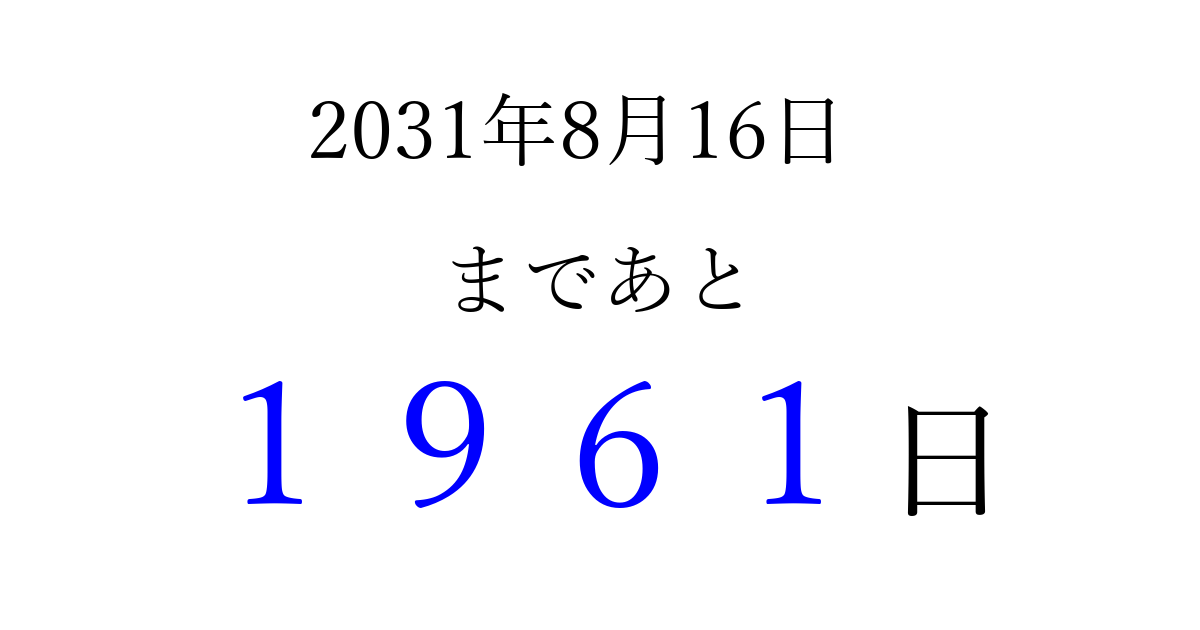 2031年8月16日(土)まで あと 9999 日です 追加すると、トップページからすぐ選べるようになります ※2026/04/03現在の結果です。 最新の状態に更新する ↓シェアして、タイムライン上にカウントダウンを表示しよう!↓ 📤 この結果を共有する Tweet シェア Threads Bluesky 別の日付でカウントダウン 2031年8月のカレンダー このページをブックマークに追加すると、いつでもカウントダウンを確認できます。 (PC: Ctrl+D / Mac: ⌘+D) hitome-notes.comでは以下のページも運営しています。 指定日と期間から日付を計算 | ガチャ確率計算・シミュレーション | プライバシー・ポリシー 運営者:Avocado