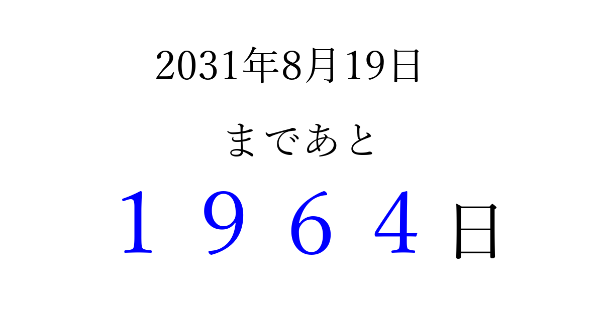 2031年8月19日(火)まで あと 9999 日です 追加すると、トップページからすぐ選べるようになります ※2026/04/03現在の結果です。 最新の状態に更新する ↓シェアして、タイムライン上にカウントダウンを表示しよう!↓ 📤 この結果を共有する Tweet シェア Threads Bluesky 別の日付でカウントダウン 2031年8月のカレンダー このページをブックマークに追加すると、いつでもカウントダウンを確認できます。 (PC: Ctrl+D / Mac: ⌘+D) hitome-notes.comでは以下のページも運営しています。 指定日と期間から日付を計算 | ガチャ確率計算・シミュレーション | プライバシー・ポリシー 運営者:Avocado