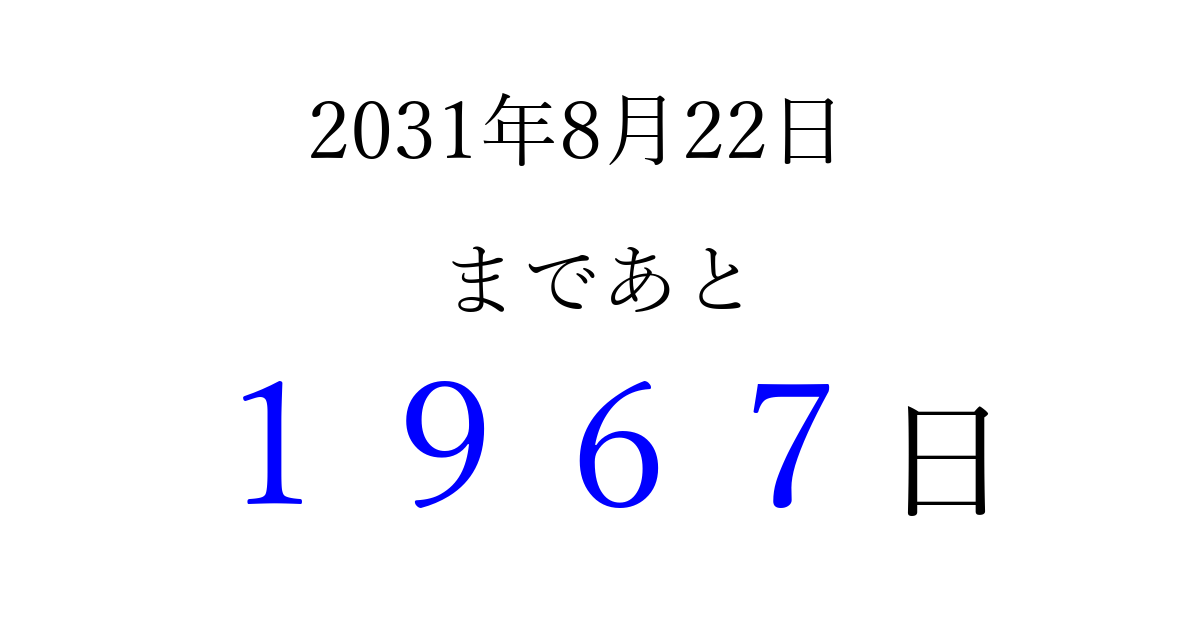 2031年8月22日(金)まで あと 9999 日です 追加すると、トップページからすぐ選べるようになります ※2026/04/03現在の結果です。 最新の状態に更新する ↓シェアして、タイムライン上にカウントダウンを表示しよう!↓ 📤 この結果を共有する Tweet シェア Threads Bluesky 別の日付でカウントダウン 2031年8月のカレンダー このページをブックマークに追加すると、いつでもカウントダウンを確認できます。 (PC: Ctrl+D / Mac: ⌘+D) hitome-notes.comでは以下のページも運営しています。 指定日と期間から日付を計算 | ガチャ確率計算・シミュレーション | プライバシー・ポリシー 運営者:Avocado