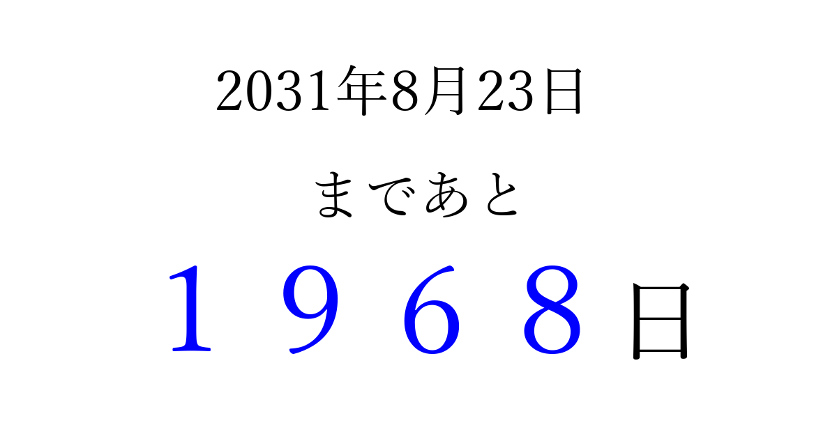 2031年8月23日(土)まで あと 9999 日です 追加すると、トップページからすぐ選べるようになります ※2026/04/03現在の結果です。 最新の状態に更新する ↓シェアして、タイムライン上にカウントダウンを表示しよう!↓ 📤 この結果を共有する Tweet シェア Threads Bluesky 別の日付でカウントダウン 2031年8月のカレンダー このページをブックマークに追加すると、いつでもカウントダウンを確認できます。 (PC: Ctrl+D / Mac: ⌘+D) hitome-notes.comでは以下のページも運営しています。 指定日と期間から日付を計算 | ガチャ確率計算・シミュレーション | プライバシー・ポリシー 運営者:Avocado