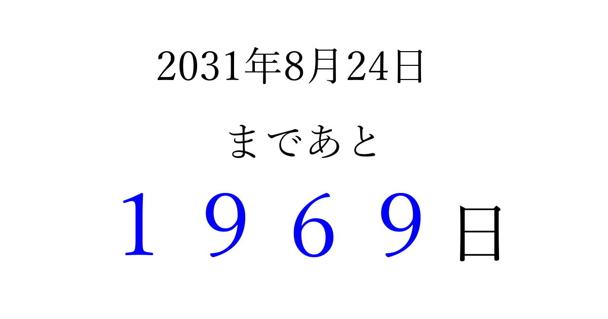 2031年8月24日(日)まで あと 9999 日です 追加すると、トップページからすぐ選べるようになります ※2026/04/03現在の結果です。 最新の状態に更新する ↓シェアして、タイムライン上にカウントダウンを表示しよう!↓ 📤 この結果を共有する Tweet シェア Threads Bluesky 別の日付でカウントダウン 2031年8月のカレンダー このページをブックマークに追加すると、いつでもカウントダウンを確認できます。 (PC: Ctrl+D / Mac: ⌘+D) hitome-notes.comでは以下のページも運営しています。 指定日と期間から日付を計算 | ガチャ確率計算・シミュレーション | プライバシー・ポリシー 運営者:Avocado