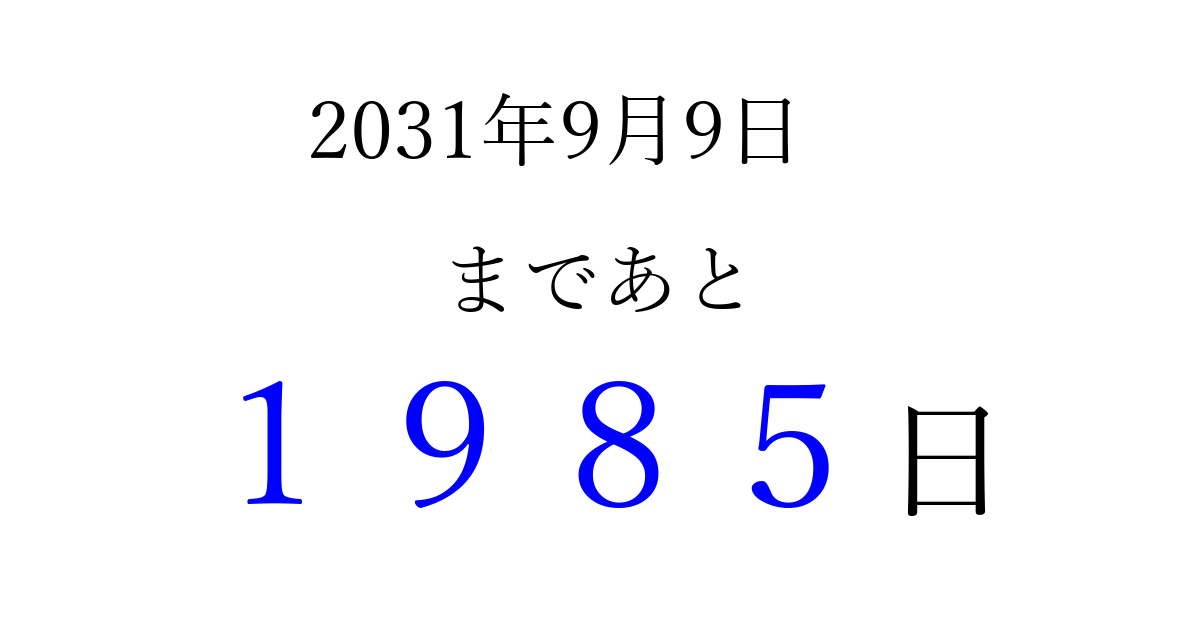 2031年9月9日(火)まで あと 9999 日です 追加すると、トップページからすぐ選べるようになります ※2026/04/03現在の結果です。 最新の状態に更新する ↓シェアして、タイムライン上にカウントダウンを表示しよう!↓ 📤 この結果を共有する Tweet シェア Threads Bluesky 別の日付でカウントダウン 2031年9月のカレンダー このページをブックマークに追加すると、いつでもカウントダウンを確認できます。 (PC: Ctrl+D / Mac: ⌘+D) hitome-notes.comでは以下のページも運営しています。 指定日と期間から日付を計算 | ガチャ確率計算・シミュレーション | プライバシー・ポリシー 運営者:Avocado