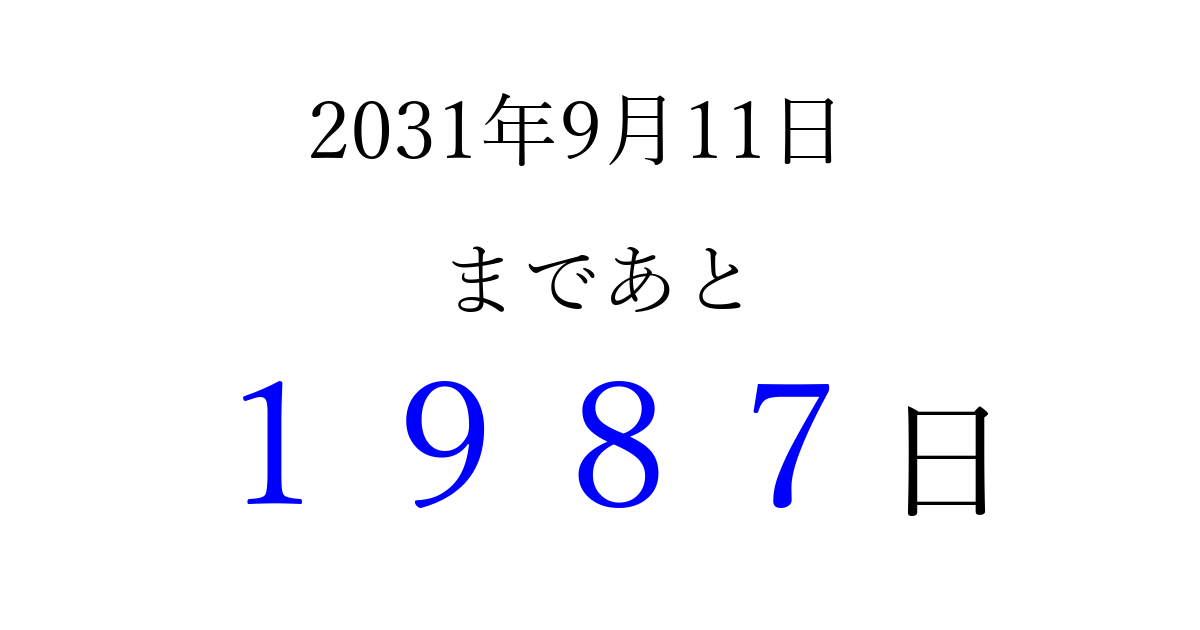 2031年9月11日(木)まで あと 9999 日です 追加すると、トップページからすぐ選べるようになります ※2026/04/03現在の結果です。 最新の状態に更新する ↓シェアして、タイムライン上にカウントダウンを表示しよう!↓ 📤 この結果を共有する Tweet シェア Threads Bluesky 別の日付でカウントダウン 2031年9月のカレンダー このページをブックマークに追加すると、いつでもカウントダウンを確認できます。 (PC: Ctrl+D / Mac: ⌘+D) hitome-notes.comでは以下のページも運営しています。 指定日と期間から日付を計算 | ガチャ確率計算・シミュレーション | プライバシー・ポリシー 運営者:Avocado