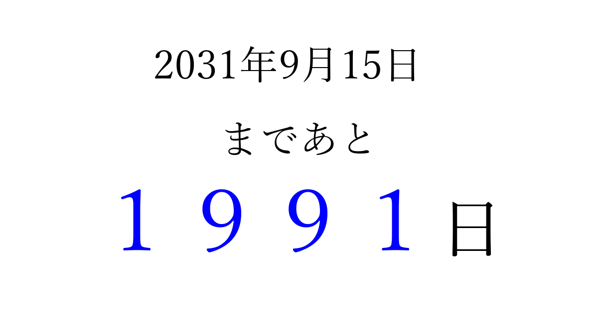 2031年9月15日(月)まで あと 9999 日です 追加すると、トップページからすぐ選べるようになります ※2026/04/03現在の結果です。 最新の状態に更新する ↓シェアして、タイムライン上にカウントダウンを表示しよう!↓ 📤 この結果を共有する Tweet シェア Threads Bluesky 別の日付でカウントダウン 2031年9月のカレンダー このページをブックマークに追加すると、いつでもカウントダウンを確認できます。 (PC: Ctrl+D / Mac: ⌘+D) hitome-notes.comでは以下のページも運営しています。 指定日と期間から日付を計算 | ガチャ確率計算・シミュレーション | プライバシー・ポリシー 運営者:Avocado