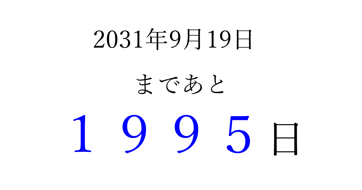 2031年9月19日(金)まで あと 9999 日です 追加すると、トップページからすぐ選べるようになります ※2026/04/03現在の結果です。 最新の状態に更新する ↓シェアして、タイムライン上にカウントダウンを表示しよう!↓ 📤 この結果を共有する Tweet シェア Threads Bluesky 別の日付でカウントダウン 2031年9月のカレンダー このページをブックマークに追加すると、いつでもカウントダウンを確認できます。 (PC: Ctrl+D / Mac: ⌘+D) hitome-notes.comでは以下のページも運営しています。 指定日と期間から日付を計算 | ガチャ確率計算・シミュレーション | プライバシー・ポリシー 運営者:Avocado
