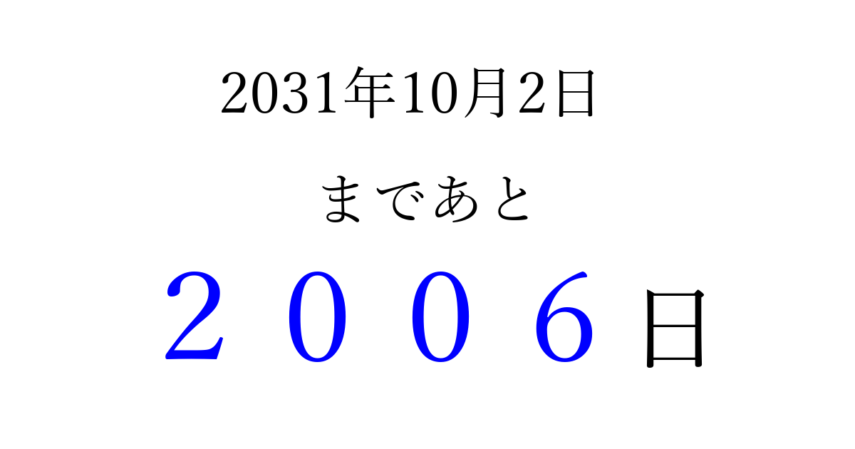 2031年10月2日(木)まで あと 9999 日です 追加すると、トップページからすぐ選べるようになります ※2026/04/05現在の結果です。 最新の状態に更新する ↓シェアして、タイムライン上にカウントダウンを表示しよう!↓ 📤 この結果を共有する Tweet シェア Threads Bluesky 別の日付でカウントダウン 2031年10月のカレンダー このページをブックマークに追加すると、いつでもカウントダウンを確認できます。 (PC: Ctrl+D / Mac: ⌘+D) hitome-notes.comでは以下のページも運営しています。 指定日と期間から日付を計算 | ガチャ確率計算・シミュレーション | プライバシー・ポリシー 運営者:Avocado