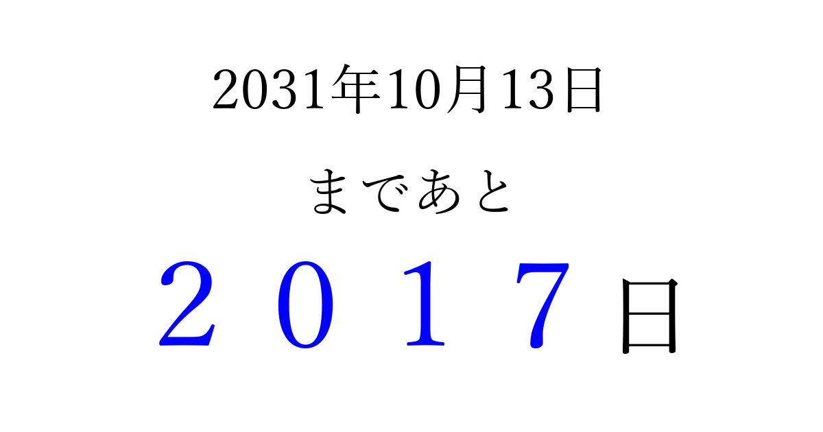 2031年10月13日(月)まで あと 9999 日です 追加すると、トップページからすぐ選べるようになります ※2026/04/05現在の結果です。 最新の状態に更新する ↓シェアして、タイムライン上にカウントダウンを表示しよう!↓ 📤 この結果を共有する Tweet シェア Threads Bluesky 別の日付でカウントダウン 2031年10月のカレンダー このページをブックマークに追加すると、いつでもカウントダウンを確認できます。 (PC: Ctrl+D / Mac: ⌘+D) hitome-notes.comでは以下のページも運営しています。 指定日と期間から日付を計算 | ガチャ確率計算・シミュレーション | プライバシー・ポリシー 運営者:Avocado