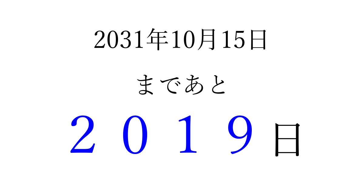 2031年10月15日(水)まで あと 9999 日です 追加すると、トップページからすぐ選べるようになります ※2026/04/05現在の結果です。 最新の状態に更新する ↓シェアして、タイムライン上にカウントダウンを表示しよう!↓ 📤 この結果を共有する Tweet シェア Threads Bluesky 別の日付でカウントダウン 2031年10月のカレンダー このページをブックマークに追加すると、いつでもカウントダウンを確認できます。 (PC: Ctrl+D / Mac: ⌘+D) hitome-notes.comでは以下のページも運営しています。 指定日と期間から日付を計算 | ガチャ確率計算・シミュレーション | プライバシー・ポリシー 運営者:Avocado