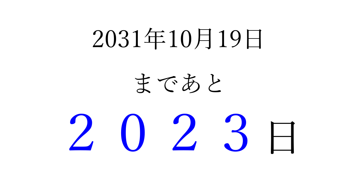 2031年10月19日(日)まで あと 9999 日です 追加すると、トップページからすぐ選べるようになります ※2026/04/05現在の結果です。 最新の状態に更新する ↓シェアして、タイムライン上にカウントダウンを表示しよう!↓ 📤 この結果を共有する Tweet シェア Threads Bluesky 別の日付でカウントダウン 2031年10月のカレンダー このページをブックマークに追加すると、いつでもカウントダウンを確認できます。 (PC: Ctrl+D / Mac: ⌘+D) hitome-notes.comでは以下のページも運営しています。 指定日と期間から日付を計算 | ガチャ確率計算・シミュレーション | プライバシー・ポリシー 運営者:Avocado