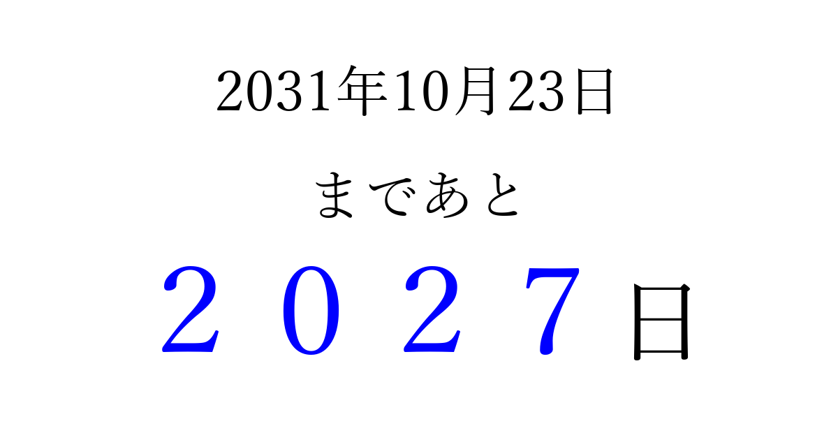 2031年10月23日(木)まで あと 9999 日です 追加すると、トップページからすぐ選べるようになります ※2026/04/05現在の結果です。 最新の状態に更新する ↓シェアして、タイムライン上にカウントダウンを表示しよう!↓ 📤 この結果を共有する Tweet シェア Threads Bluesky 別の日付でカウントダウン 2031年10月のカレンダー このページをブックマークに追加すると、いつでもカウントダウンを確認できます。 (PC: Ctrl+D / Mac: ⌘+D) hitome-notes.comでは以下のページも運営しています。 指定日と期間から日付を計算 | ガチャ確率計算・シミュレーション | プライバシー・ポリシー 運営者:Avocado