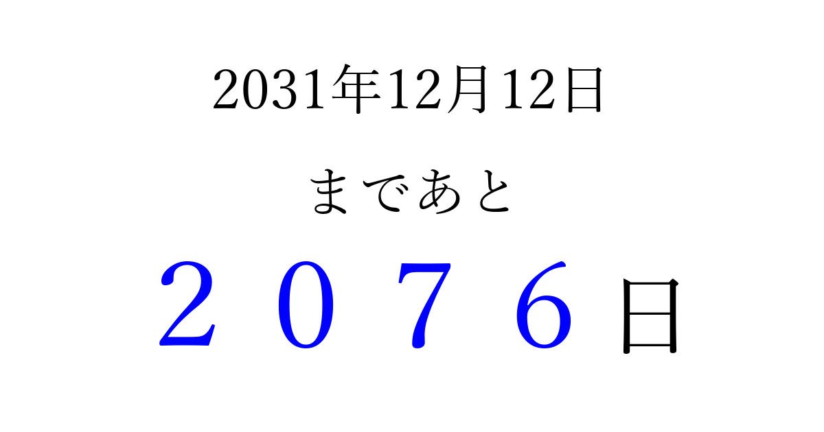 2031年12月12日(金)まで あと 9999 日です 追加すると、トップページからすぐ選べるようになります ※2026/04/06現在の結果です。 最新の状態に更新する ↓シェアして、タイムライン上にカウントダウンを表示しよう!↓ 📤 この結果を共有する Tweet シェア Threads Bluesky 別の日付でカウントダウン 2031年12月のカレンダー このページをブックマークに追加すると、いつでもカウントダウンを確認できます。 (PC: Ctrl+D / Mac: ⌘+D) hitome-notes.comでは以下のページも運営しています。 指定日と期間から日付を計算 | ガチャ確率計算・シミュレーション | プライバシー・ポリシー 運営者:Avocado