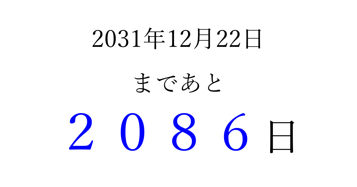 2031年12月22日(月)まで あと 9999 日です 追加すると、トップページからすぐ選べるようになります ※2026/04/06現在の結果です。 最新の状態に更新する ↓シェアして、タイムライン上にカウントダウンを表示しよう!↓ 📤 この結果を共有する Tweet シェア Threads Bluesky 別の日付でカウントダウン 2031年12月のカレンダー このページをブックマークに追加すると、いつでもカウントダウンを確認できます。 (PC: Ctrl+D / Mac: ⌘+D) hitome-notes.comでは以下のページも運営しています。 指定日と期間から日付を計算 | ガチャ確率計算・シミュレーション | プライバシー・ポリシー 運営者:Avocado