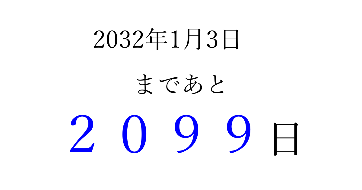 2032年1月3日(土)まで あと 9999 日です 追加すると、トップページからすぐ選べるようになります ※2026/04/05現在の結果です。 最新の状態に更新する ↓シェアして、タイムライン上にカウントダウンを表示しよう!↓ 📤 この結果を共有する Tweet シェア Threads Bluesky 別の日付でカウントダウン 2032年1月のカレンダー このページをブックマークに追加すると、いつでもカウントダウンを確認できます。 (PC: Ctrl+D / Mac: ⌘+D) hitome-notes.comでは以下のページも運営しています。 指定日と期間から日付を計算 | ガチャ確率計算・シミュレーション | プライバシー・ポリシー 運営者:Avocado
