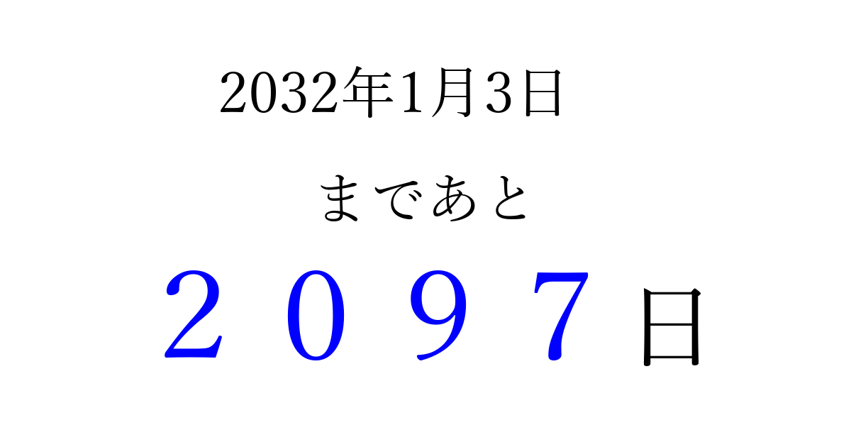 2032年1月3日(土)まで あと 9999 日です 追加すると、トップページからすぐ選べるようになります ※2026/04/07現在の結果です。 最新の状態に更新する ↓シェアして、タイムライン上にカウントダウンを表示しよう!↓ 📤 この結果を共有する Tweet シェア Threads Bluesky 別の日付でカウントダウン 2032年1月のカレンダー このページをブックマークに追加すると、いつでもカウントダウンを確認できます。 (PC: Ctrl+D / Mac: ⌘+D) hitome-notes.comでは以下のページも運営しています。 指定日と期間から日付を計算 | ガチャ確率計算・シミュレーション | プライバシー・ポリシー 運営者:Avocado