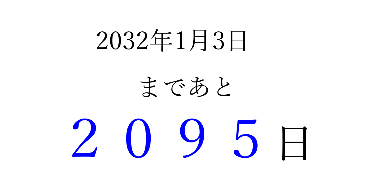 2032年1月3日(土)まで あと 9999 日です 追加すると、トップページからすぐ選べるようになります ※2026/04/09現在の結果です。 最新の状態に更新する ↓シェアして、タイムライン上にカウントダウンを表示しよう!↓ 📤 この結果を共有する Tweet シェア Threads Bluesky 別の日付でカウントダウン 2032年1月のカレンダー このページをブックマークに追加すると、いつでもカウントダウンを確認できます。 (PC: Ctrl+D / Mac: ⌘+D) hitome-notes.comでは以下のページも運営しています。 指定日と期間から日付を計算 | ガチャ確率計算・シミュレーション | プライバシー・ポリシー 運営者:Avocado