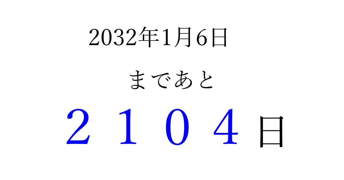 2032年1月6日(火)まで あと 9999 日です 追加すると、トップページからすぐ選べるようになります ※2026/04/03現在の結果です。 最新の状態に更新する ↓シェアして、タイムライン上にカウントダウンを表示しよう!↓ 📤 この結果を共有する Tweet シェア Threads Bluesky 別の日付でカウントダウン 2032年1月のカレンダー このページをブックマークに追加すると、いつでもカウントダウンを確認できます。 (PC: Ctrl+D / Mac: ⌘+D) hitome-notes.comでは以下のページも運営しています。 指定日と期間から日付を計算 | ガチャ確率計算・シミュレーション | プライバシー・ポリシー 運営者:Avocado