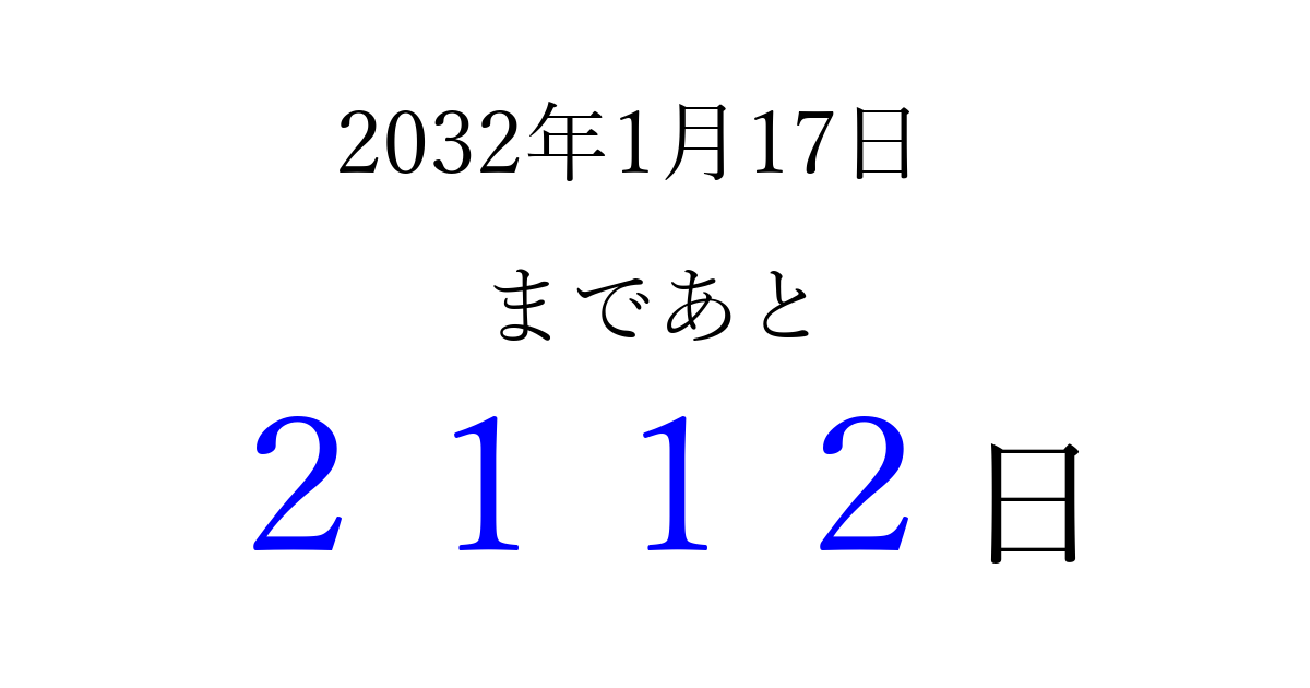 2032年1月17日(土)まで あと 9999 日です 追加すると、トップページからすぐ選べるようになります ※2026/04/06現在の結果です。 最新の状態に更新する ↓シェアして、タイムライン上にカウントダウンを表示しよう!↓ 📤 この結果を共有する Tweet シェア Threads Bluesky 別の日付でカウントダウン 2032年1月のカレンダー このページをブックマークに追加すると、いつでもカウントダウンを確認できます。 (PC: Ctrl+D / Mac: ⌘+D) hitome-notes.comでは以下のページも運営しています。 指定日と期間から日付を計算 | ガチャ確率計算・シミュレーション | プライバシー・ポリシー 運営者:Avocado
