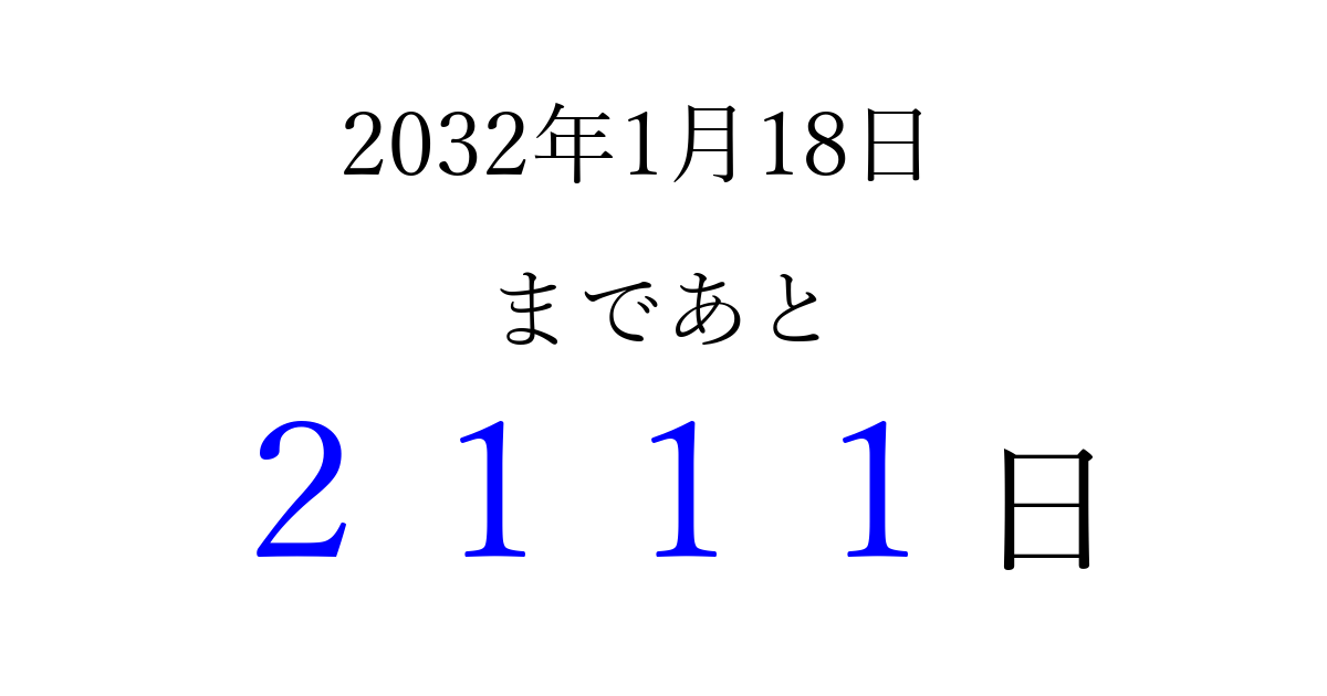 2032年1月18日(日)まで あと 9999 日です 追加すると、トップページからすぐ選べるようになります ※2026/04/08現在の結果です。 最新の状態に更新する ↓シェアして、タイムライン上にカウントダウンを表示しよう!↓ 📤 この結果を共有する Tweet シェア Threads Bluesky 別の日付でカウントダウン 2032年1月のカレンダー このページをブックマークに追加すると、いつでもカウントダウンを確認できます。 (PC: Ctrl+D / Mac: ⌘+D) hitome-notes.comでは以下のページも運営しています。 指定日と期間から日付を計算 | ガチャ確率計算・シミュレーション | プライバシー・ポリシー 運営者:Avocado