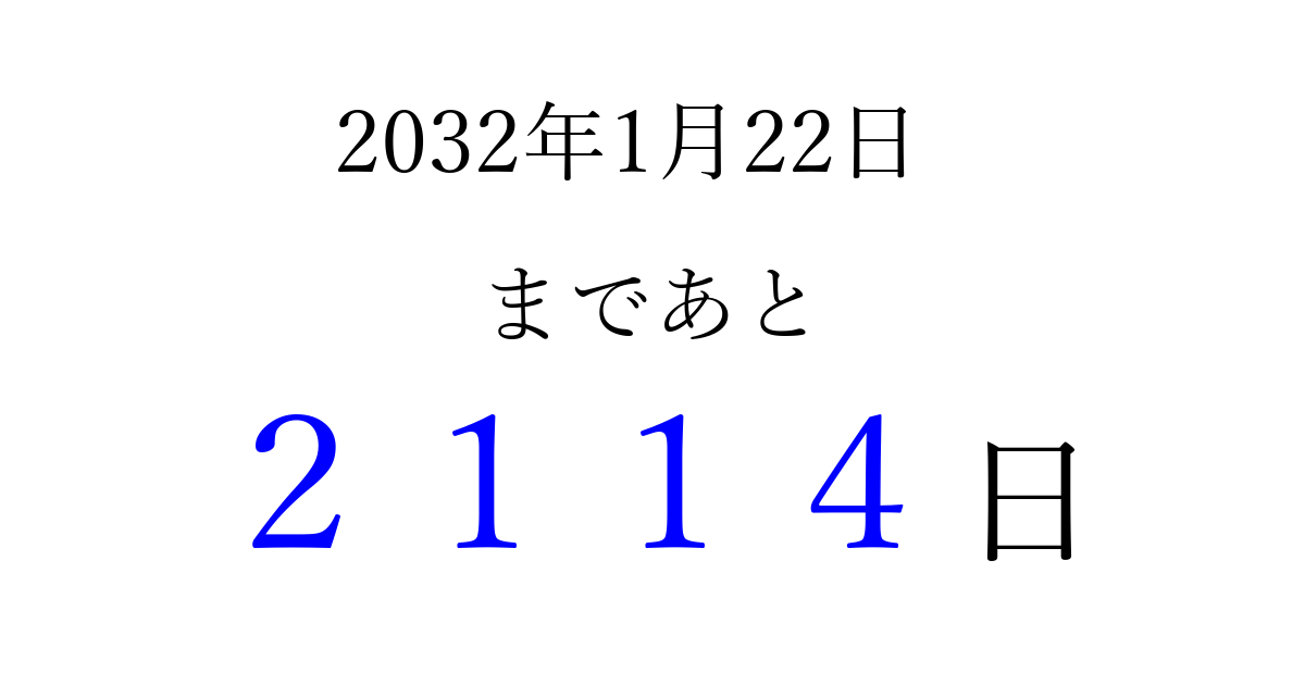 2032年1月22日(木)まで あと 9999 日です 追加すると、トップページからすぐ選べるようになります ※2026/04/09現在の結果です。 最新の状態に更新する ↓シェアして、タイムライン上にカウントダウンを表示しよう!↓ 📤 この結果を共有する Tweet シェア Threads Bluesky 別の日付でカウントダウン 2032年1月のカレンダー このページをブックマークに追加すると、いつでもカウントダウンを確認できます。 (PC: Ctrl+D / Mac: ⌘+D) hitome-notes.comでは以下のページも運営しています。 指定日と期間から日付を計算 | ガチャ確率計算・シミュレーション | プライバシー・ポリシー 運営者:Avocado