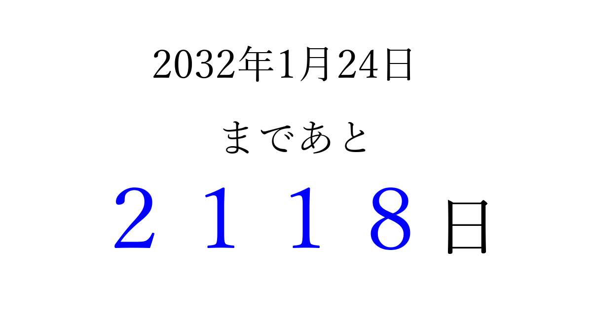 2032年1月24日(土)まで あと 9999 日です 追加すると、トップページからすぐ選べるようになります ※2026/04/07現在の結果です。 最新の状態に更新する ↓シェアして、タイムライン上にカウントダウンを表示しよう!↓ 📤 この結果を共有する Tweet シェア Threads Bluesky 別の日付でカウントダウン 2032年1月のカレンダー このページをブックマークに追加すると、いつでもカウントダウンを確認できます。 (PC: Ctrl+D / Mac: ⌘+D) hitome-notes.comでは以下のページも運営しています。 指定日と期間から日付を計算 | ガチャ確率計算・シミュレーション | プライバシー・ポリシー 運営者:Avocado