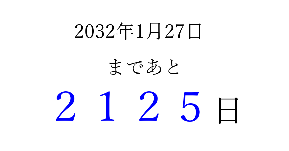 2032年1月27日(火)まで あと 9999 日です 追加すると、トップページからすぐ選べるようになります ※2026/04/03現在の結果です。 最新の状態に更新する ↓シェアして、タイムライン上にカウントダウンを表示しよう!↓ 📤 この結果を共有する Tweet シェア Threads Bluesky 別の日付でカウントダウン 2032年1月のカレンダー このページをブックマークに追加すると、いつでもカウントダウンを確認できます。 (PC: Ctrl+D / Mac: ⌘+D) hitome-notes.comでは以下のページも運営しています。 指定日と期間から日付を計算 | ガチャ確率計算・シミュレーション | プライバシー・ポリシー 運営者:Avocado