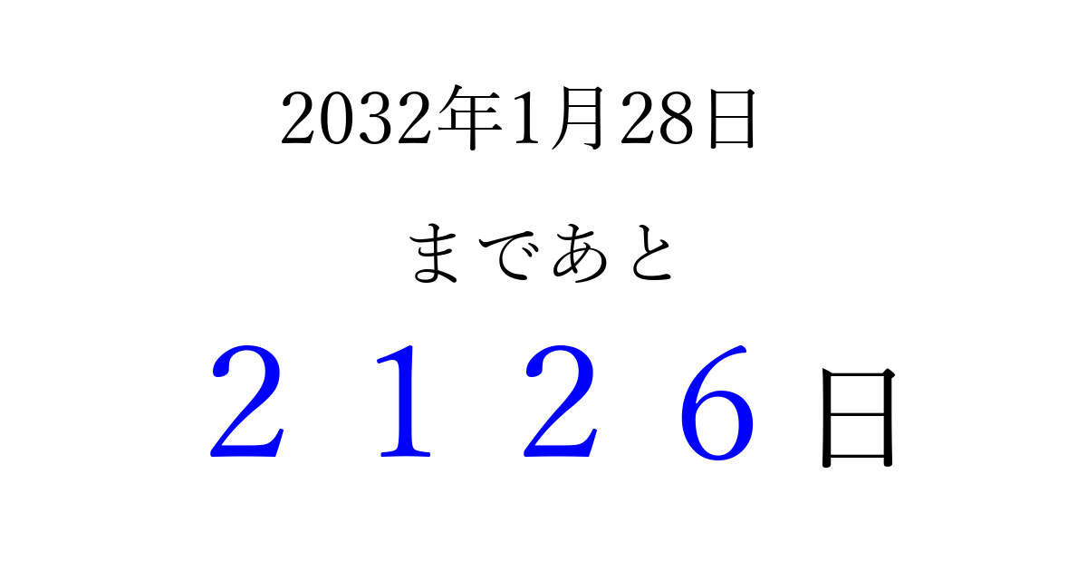 2032年1月28日(水)まで あと 9999 日です 追加すると、トップページからすぐ選べるようになります ※2026/04/03現在の結果です。 最新の状態に更新する ↓シェアして、タイムライン上にカウントダウンを表示しよう!↓ 📤 この結果を共有する Tweet シェア Threads Bluesky 別の日付でカウントダウン 2032年1月のカレンダー このページをブックマークに追加すると、いつでもカウントダウンを確認できます。 (PC: Ctrl+D / Mac: ⌘+D) hitome-notes.comでは以下のページも運営しています。 指定日と期間から日付を計算 | ガチャ確率計算・シミュレーション | プライバシー・ポリシー 運営者:Avocado