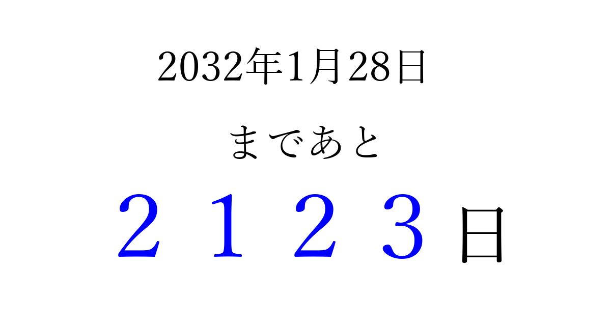 2032年1月28日(水)まで あと 9999 日です 追加すると、トップページからすぐ選べるようになります ※2026/04/06現在の結果です。 最新の状態に更新する ↓シェアして、タイムライン上にカウントダウンを表示しよう!↓ 📤 この結果を共有する Tweet シェア Threads Bluesky 別の日付でカウントダウン 2032年1月のカレンダー このページをブックマークに追加すると、いつでもカウントダウンを確認できます。 (PC: Ctrl+D / Mac: ⌘+D) hitome-notes.comでは以下のページも運営しています。 指定日と期間から日付を計算 | ガチャ確率計算・シミュレーション | プライバシー・ポリシー 運営者:Avocado