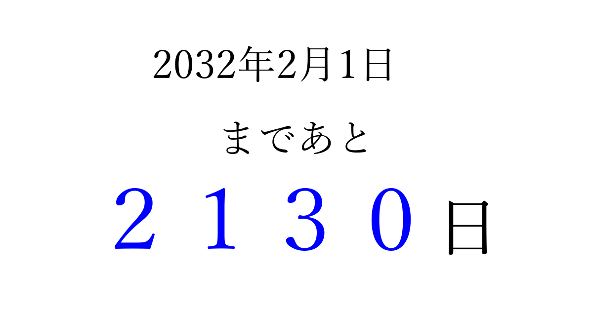 2032年2月1日(日)まで あと 9999 日です 追加すると、トップページからすぐ選べるようになります ※2026/04/03現在の結果です。 最新の状態に更新する ↓シェアして、タイムライン上にカウントダウンを表示しよう!↓ 📤 この結果を共有する Tweet シェア Threads Bluesky 別の日付でカウントダウン 2032年2月のカレンダー このページをブックマークに追加すると、いつでもカウントダウンを確認できます。 (PC: Ctrl+D / Mac: ⌘+D) hitome-notes.comでは以下のページも運営しています。 指定日と期間から日付を計算 | ガチャ確率計算・シミュレーション | プライバシー・ポリシー 運営者:Avocado