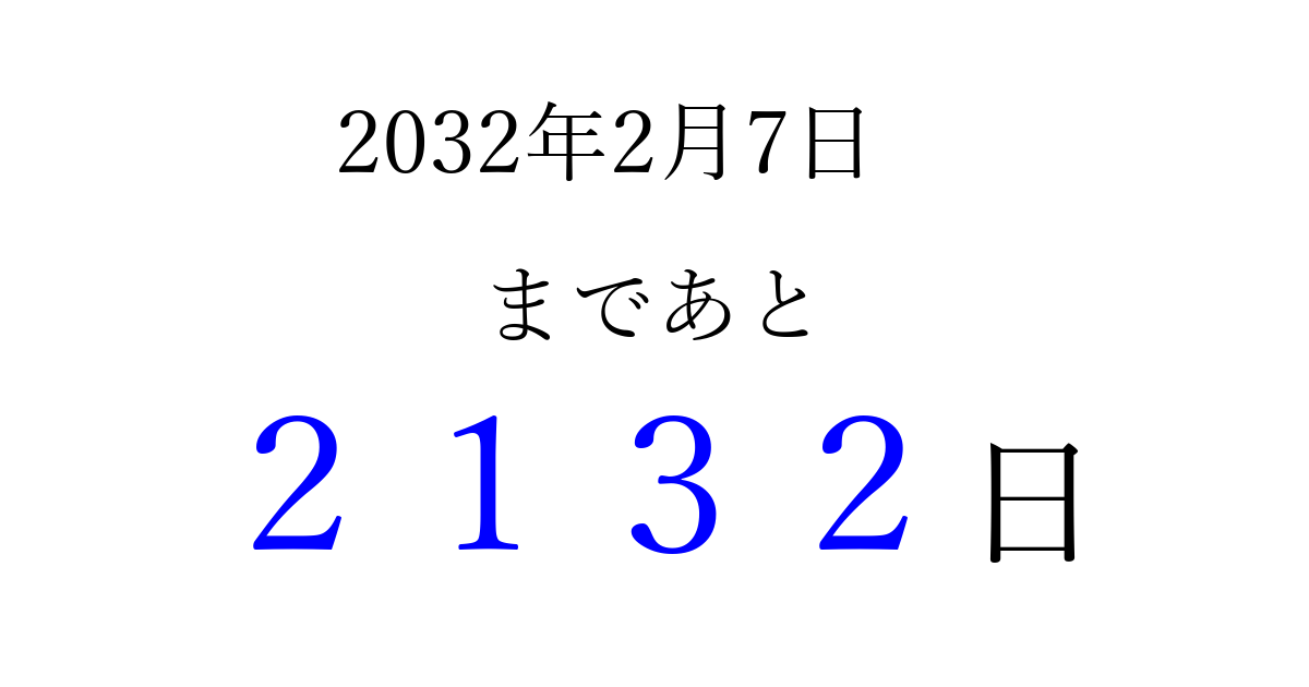 2032年2月7日(土)まで あと 9999 日です 追加すると、トップページからすぐ選べるようになります ※2026/04/07現在の結果です。 最新の状態に更新する ↓シェアして、タイムライン上にカウントダウンを表示しよう!↓ 📤 この結果を共有する Tweet シェア Threads Bluesky 別の日付でカウントダウン 2032年2月のカレンダー このページをブックマークに追加すると、いつでもカウントダウンを確認できます。 (PC: Ctrl+D / Mac: ⌘+D) hitome-notes.comでは以下のページも運営しています。 指定日と期間から日付を計算 | ガチャ確率計算・シミュレーション | プライバシー・ポリシー 運営者:Avocado