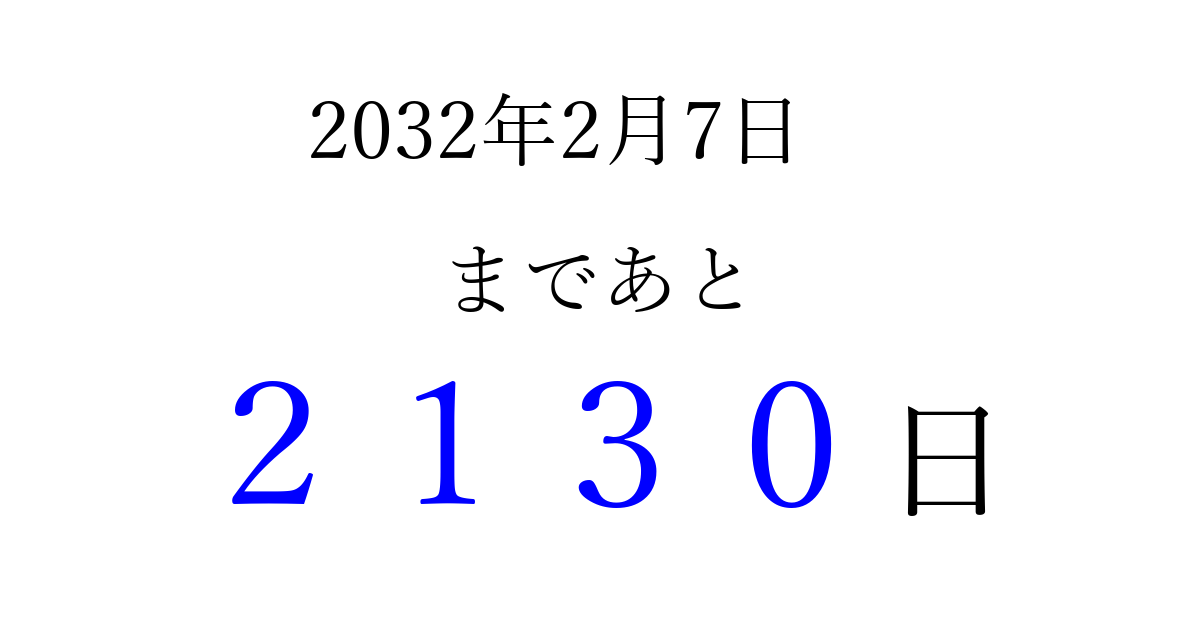 2032年2月7日(土)まで あと 9999 日です 追加すると、トップページからすぐ選べるようになります ※2026/04/09現在の結果です。 最新の状態に更新する ↓シェアして、タイムライン上にカウントダウンを表示しよう!↓ 📤 この結果を共有する Tweet シェア Threads Bluesky 別の日付でカウントダウン 2032年2月のカレンダー このページをブックマークに追加すると、いつでもカウントダウンを確認できます。 (PC: Ctrl+D / Mac: ⌘+D) hitome-notes.comでは以下のページも運営しています。 指定日と期間から日付を計算 | ガチャ確率計算・シミュレーション | プライバシー・ポリシー 運営者:Avocado
