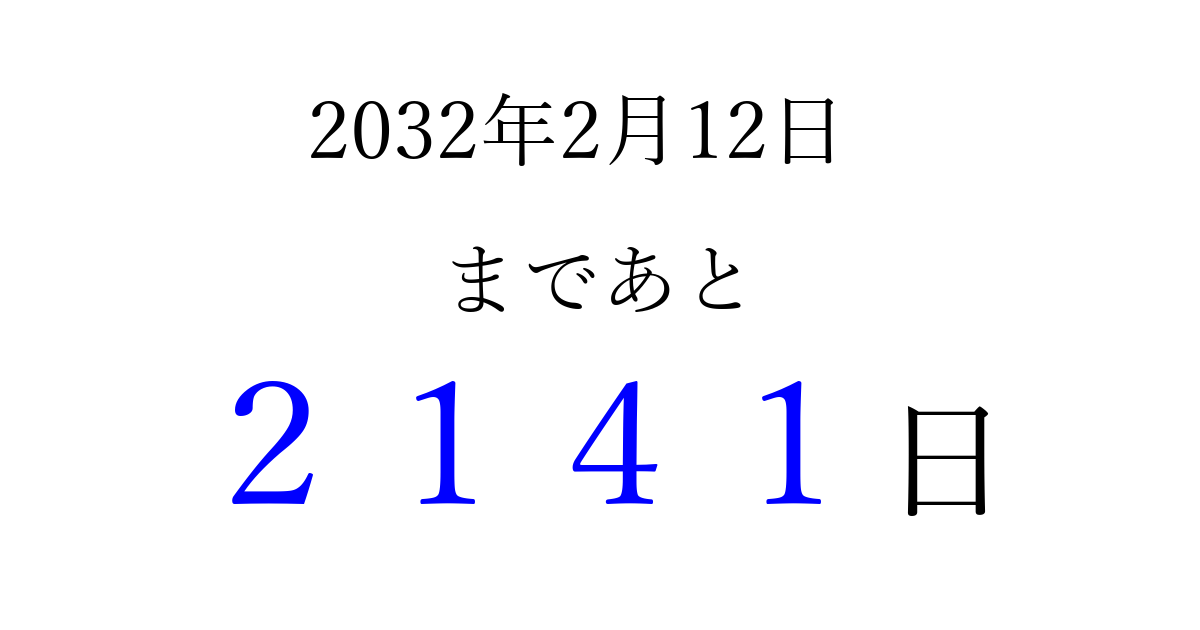 2032年2月12日(木)まで あと 9999 日です 追加すると、トップページからすぐ選べるようになります ※2026/04/03現在の結果です。 最新の状態に更新する ↓シェアして、タイムライン上にカウントダウンを表示しよう!↓ 📤 この結果を共有する Tweet シェア Threads Bluesky 別の日付でカウントダウン 2032年2月のカレンダー このページをブックマークに追加すると、いつでもカウントダウンを確認できます。 (PC: Ctrl+D / Mac: ⌘+D) hitome-notes.comでは以下のページも運営しています。 指定日と期間から日付を計算 | ガチャ確率計算・シミュレーション | プライバシー・ポリシー 運営者:Avocado