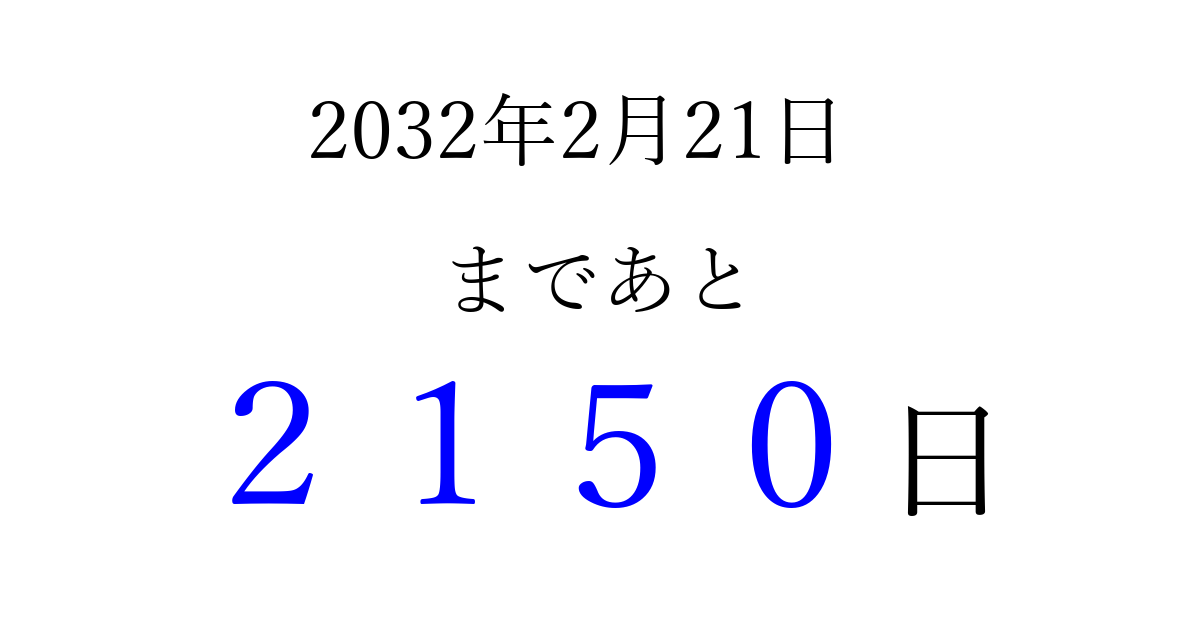 2032年2月21日(土)まで あと 9999 日です 追加すると、トップページからすぐ選べるようになります ※2026/04/03現在の結果です。 最新の状態に更新する ↓シェアして、タイムライン上にカウントダウンを表示しよう!↓ 📤 この結果を共有する Tweet シェア Threads Bluesky 別の日付でカウントダウン 2032年2月のカレンダー このページをブックマークに追加すると、いつでもカウントダウンを確認できます。 (PC: Ctrl+D / Mac: ⌘+D) hitome-notes.comでは以下のページも運営しています。 指定日と期間から日付を計算 | ガチャ確率計算・シミュレーション | プライバシー・ポリシー 運営者:Avocado