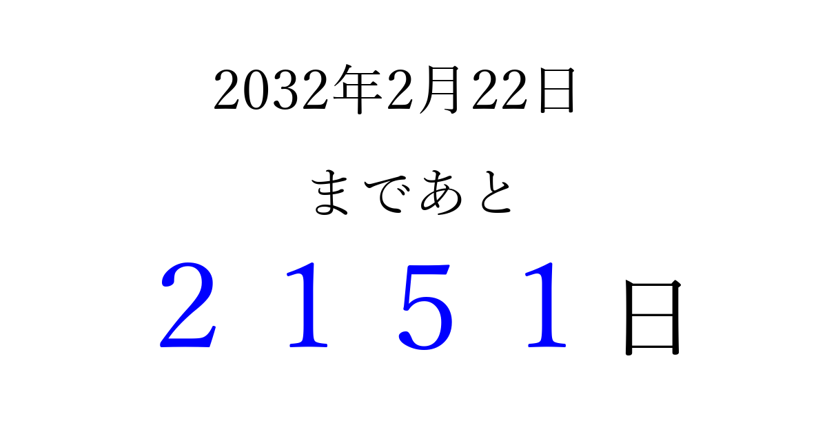 2032年2月22日(日)まで あと 9999 日です 追加すると、トップページからすぐ選べるようになります ※2026/04/03現在の結果です。 最新の状態に更新する ↓シェアして、タイムライン上にカウントダウンを表示しよう!↓ 📤 この結果を共有する Tweet シェア Threads Bluesky 別の日付でカウントダウン 2032年2月のカレンダー このページをブックマークに追加すると、いつでもカウントダウンを確認できます。 (PC: Ctrl+D / Mac: ⌘+D) hitome-notes.comでは以下のページも運営しています。 指定日と期間から日付を計算 | ガチャ確率計算・シミュレーション | プライバシー・ポリシー 運営者:Avocado