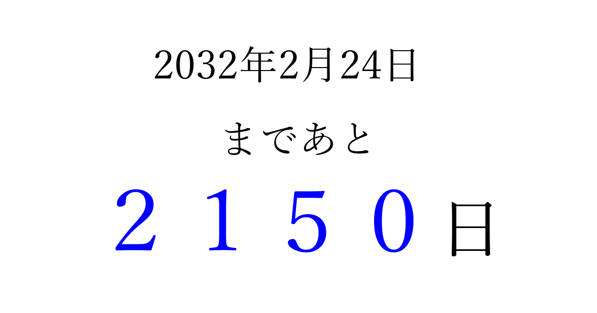 2032年2月24日(火)まで あと 9999 日です 追加すると、トップページからすぐ選べるようになります ※2026/04/06現在の結果です。 最新の状態に更新する ↓シェアして、タイムライン上にカウントダウンを表示しよう!↓ 📤 この結果を共有する Tweet シェア Threads Bluesky 別の日付でカウントダウン 2032年2月のカレンダー このページをブックマークに追加すると、いつでもカウントダウンを確認できます。 (PC: Ctrl+D / Mac: ⌘+D) hitome-notes.comでは以下のページも運営しています。 指定日と期間から日付を計算 | ガチャ確率計算・シミュレーション | プライバシー・ポリシー 運営者:Avocado