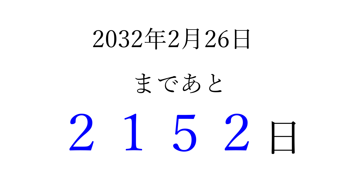 2032年2月26日(木)まで あと 9999 日です 追加すると、トップページからすぐ選べるようになります ※2026/04/06現在の結果です。 最新の状態に更新する ↓シェアして、タイムライン上にカウントダウンを表示しよう!↓ 📤 この結果を共有する Tweet シェア Threads Bluesky 別の日付でカウントダウン 2032年2月のカレンダー このページをブックマークに追加すると、いつでもカウントダウンを確認できます。 (PC: Ctrl+D / Mac: ⌘+D) hitome-notes.comでは以下のページも運営しています。 指定日と期間から日付を計算 | ガチャ確率計算・シミュレーション | プライバシー・ポリシー 運営者:Avocado