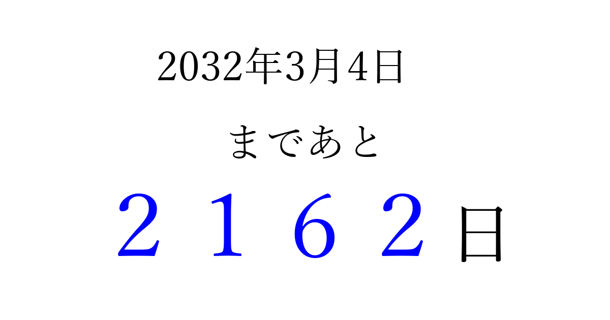 2032年3月4日(木)まで あと 9999 日です 追加すると、トップページからすぐ選べるようになります ※2026/04/03現在の結果です。 最新の状態に更新する ↓シェアして、タイムライン上にカウントダウンを表示しよう!↓ 📤 この結果を共有する Tweet シェア Threads Bluesky 別の日付でカウントダウン 2032年3月のカレンダー このページをブックマークに追加すると、いつでもカウントダウンを確認できます。 (PC: Ctrl+D / Mac: ⌘+D) hitome-notes.comでは以下のページも運営しています。 指定日と期間から日付を計算 | ガチャ確率計算・シミュレーション | プライバシー・ポリシー 運営者:Avocado
