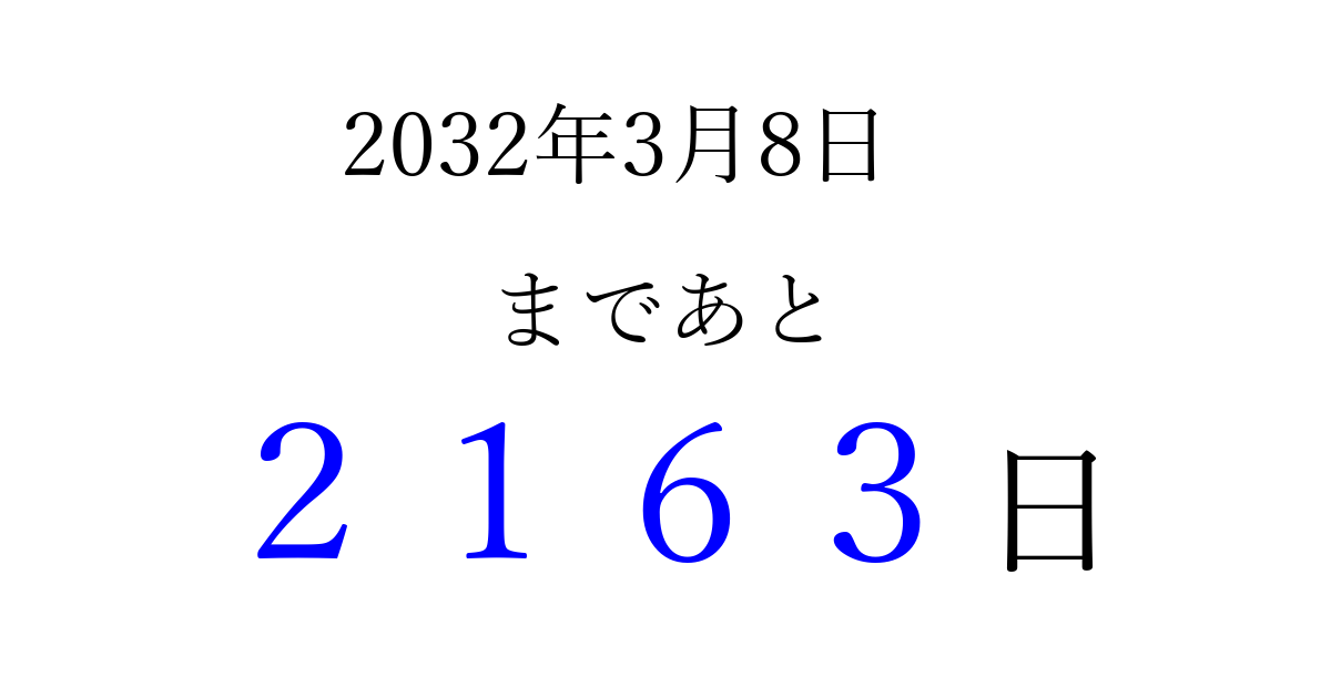 2032年3月8日(月)まで あと 9999 日です 追加すると、トップページからすぐ選べるようになります ※2026/04/06現在の結果です。 最新の状態に更新する ↓シェアして、タイムライン上にカウントダウンを表示しよう!↓ 📤 この結果を共有する Tweet シェア Threads Bluesky 別の日付でカウントダウン 2032年3月のカレンダー このページをブックマークに追加すると、いつでもカウントダウンを確認できます。 (PC: Ctrl+D / Mac: ⌘+D) hitome-notes.comでは以下のページも運営しています。 指定日と期間から日付を計算 | ガチャ確率計算・シミュレーション | プライバシー・ポリシー 運営者:Avocado