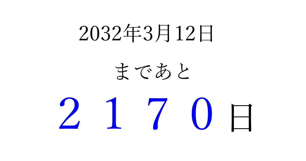 2032年3月12日(金)まで あと 9999 日です 追加すると、トップページからすぐ選べるようになります ※2026/04/03現在の結果です。 最新の状態に更新する ↓シェアして、タイムライン上にカウントダウンを表示しよう!↓ 📤 この結果を共有する Tweet シェア Threads Bluesky 別の日付でカウントダウン 2032年3月のカレンダー このページをブックマークに追加すると、いつでもカウントダウンを確認できます。 (PC: Ctrl+D / Mac: ⌘+D) hitome-notes.comでは以下のページも運営しています。 指定日と期間から日付を計算 | ガチャ確率計算・シミュレーション | プライバシー・ポリシー 運営者:Avocado