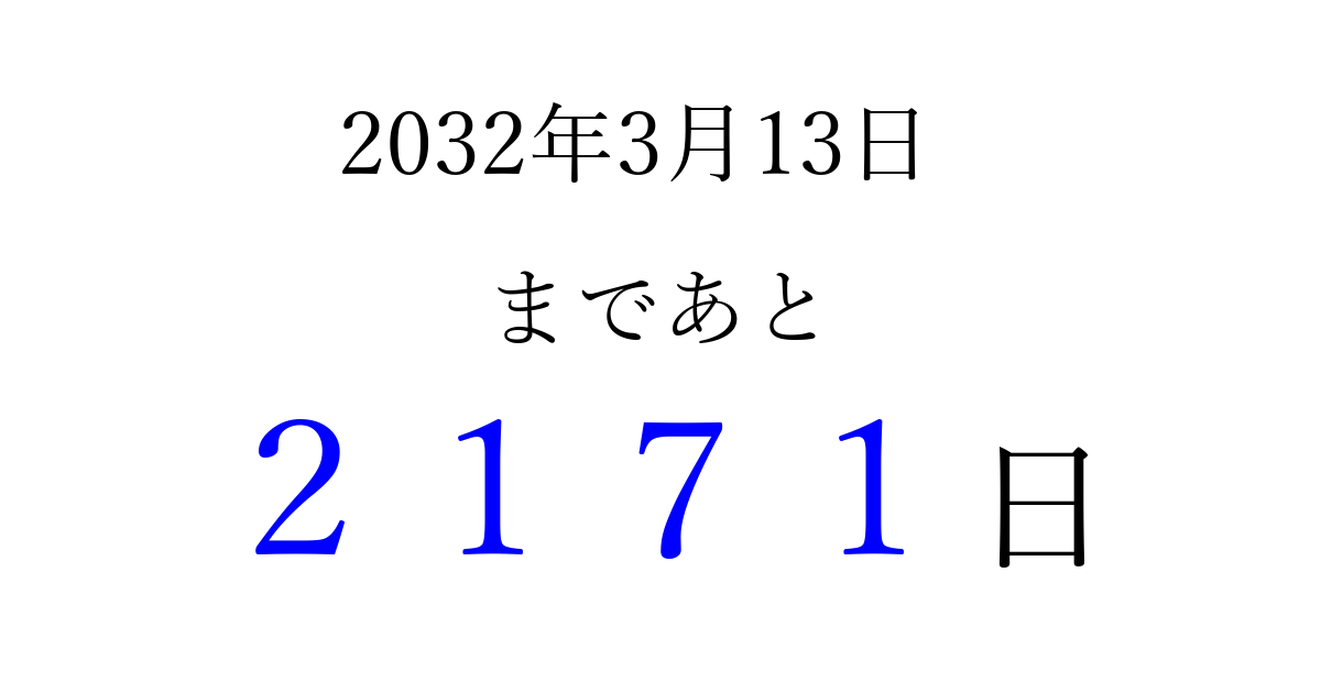 2032年3月13日(土)まで あと 9999 日です 追加すると、トップページからすぐ選べるようになります ※2026/04/03現在の結果です。 最新の状態に更新する ↓シェアして、タイムライン上にカウントダウンを表示しよう!↓ 📤 この結果を共有する Tweet シェア Threads Bluesky 別の日付でカウントダウン 2032年3月のカレンダー このページをブックマークに追加すると、いつでもカウントダウンを確認できます。 (PC: Ctrl+D / Mac: ⌘+D) hitome-notes.comでは以下のページも運営しています。 指定日と期間から日付を計算 | ガチャ確率計算・シミュレーション | プライバシー・ポリシー 運営者:Avocado