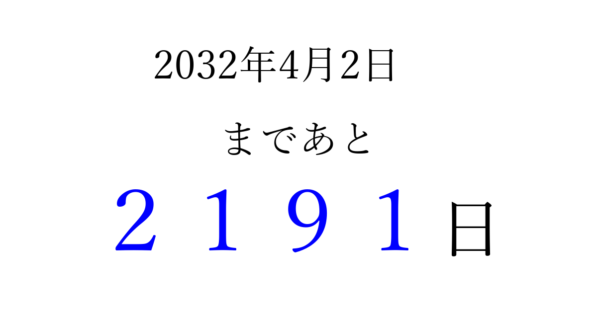 2032年4月2日(金)まで あと 9999 日です 追加すると、トップページからすぐ選べるようになります ※2026/04/03現在の結果です。 最新の状態に更新する ↓シェアして、タイムライン上にカウントダウンを表示しよう!↓ 📤 この結果を共有する Tweet シェア Threads Bluesky 別の日付でカウントダウン 2032年4月のカレンダー このページをブックマークに追加すると、いつでもカウントダウンを確認できます。 (PC: Ctrl+D / Mac: ⌘+D) hitome-notes.comでは以下のページも運営しています。 指定日と期間から日付を計算 | ガチャ確率計算・シミュレーション | プライバシー・ポリシー 運営者:Avocado