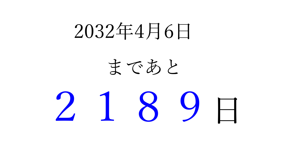 2032年4月6日(火)まで あと 9999 日です 追加すると、トップページからすぐ選べるようになります ※2026/04/09現在の結果です。 最新の状態に更新する ↓シェアして、タイムライン上にカウントダウンを表示しよう!↓ 📤 この結果を共有する Tweet シェア Threads Bluesky 別の日付でカウントダウン 2032年4月のカレンダー このページをブックマークに追加すると、いつでもカウントダウンを確認できます。 (PC: Ctrl+D / Mac: ⌘+D) hitome-notes.comでは以下のページも運営しています。 指定日と期間から日付を計算 | ガチャ確率計算・シミュレーション | プライバシー・ポリシー 運営者:Avocado