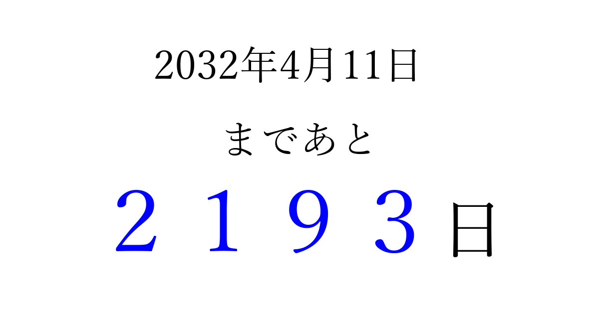2032年4月11日(日)まで あと 9999 日です 追加すると、トップページからすぐ選べるようになります ※2026/04/10現在の結果です。 最新の状態に更新する ↓シェアして、タイムライン上にカウントダウンを表示しよう!↓ 📤 この結果を共有する Tweet シェア Threads Bluesky 別の日付でカウントダウン 2032年4月のカレンダー このページをブックマークに追加すると、いつでもカウントダウンを確認できます。 (PC: Ctrl+D / Mac: ⌘+D) hitome-notes.comでは以下のページも運営しています。 指定日と期間から日付を計算 | ガチャ確率計算・シミュレーション | プライバシー・ポリシー 運営者:Avocado