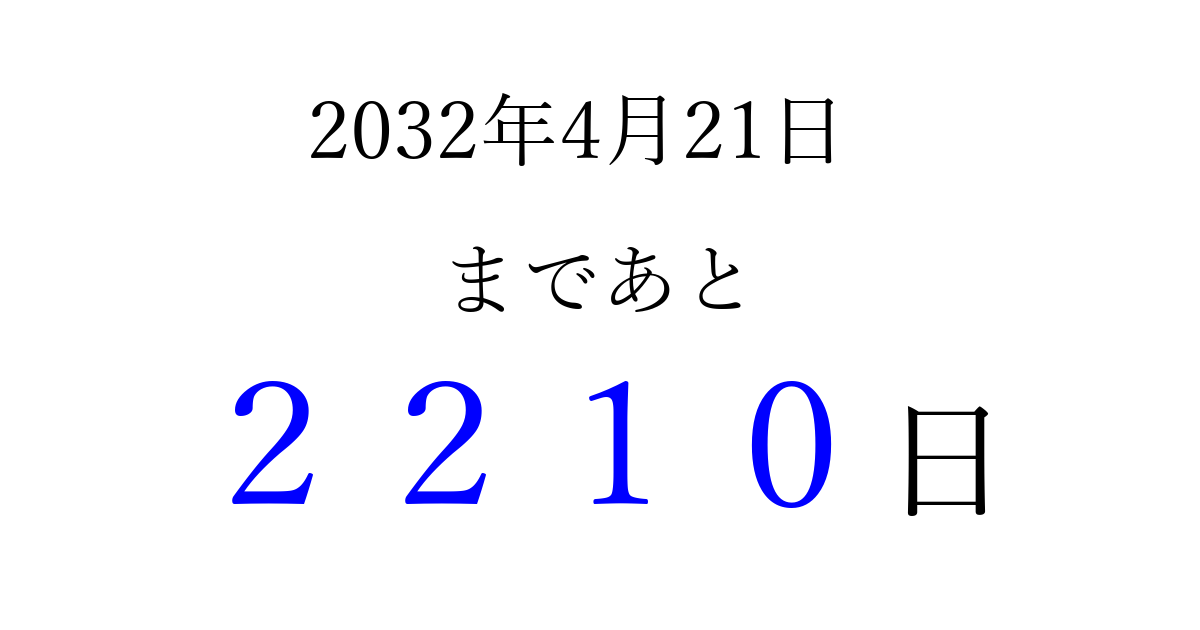 2032年4月21日(水)まで あと 9999 日です 追加すると、トップページからすぐ選べるようになります ※2026/04/03現在の結果です。 最新の状態に更新する ↓シェアして、タイムライン上にカウントダウンを表示しよう!↓ 📤 この結果を共有する Tweet シェア Threads Bluesky 別の日付でカウントダウン 2032年4月のカレンダー このページをブックマークに追加すると、いつでもカウントダウンを確認できます。 (PC: Ctrl+D / Mac: ⌘+D) hitome-notes.comでは以下のページも運営しています。 指定日と期間から日付を計算 | ガチャ確率計算・シミュレーション | プライバシー・ポリシー 運営者:Avocado