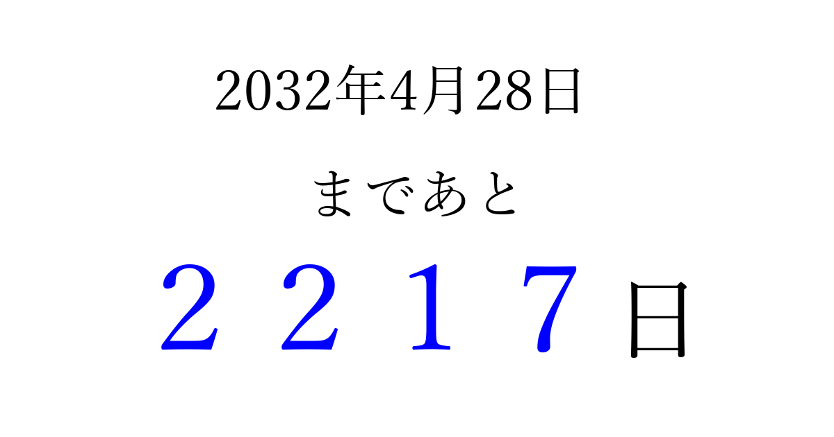 2032年4月28日(水)まで あと 9999 日です 追加すると、トップページからすぐ選べるようになります ※2026/04/03現在の結果です。 最新の状態に更新する ↓シェアして、タイムライン上にカウントダウンを表示しよう!↓ 📤 この結果を共有する Tweet シェア Threads Bluesky 別の日付でカウントダウン 2032年4月のカレンダー このページをブックマークに追加すると、いつでもカウントダウンを確認できます。 (PC: Ctrl+D / Mac: ⌘+D) hitome-notes.comでは以下のページも運営しています。 指定日と期間から日付を計算 | ガチャ確率計算・シミュレーション | プライバシー・ポリシー 運営者:Avocado